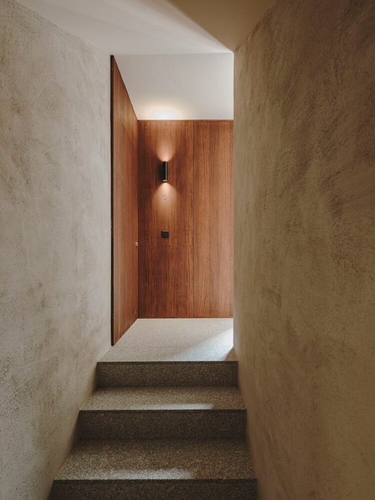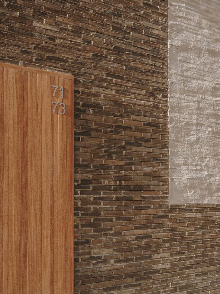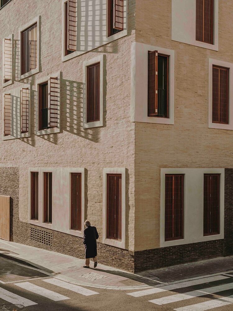 reinterpreting folding shutters brings out the wood on the façade, providing a warm tone to the building and filtering the light inside the dwelling. in this way, each user can customise how much light and privacy they want. the proportion of its spaces and grouping of windows into frames create a set of contrasts against the hefty aspect of the building and its apparently disorganised composition gives it certain urban continuity. inside, the storeys are organised through a gallery parallel to the façade that narrows and widens according to the project’s needs, thereby blurring the image of the lengthened storey.