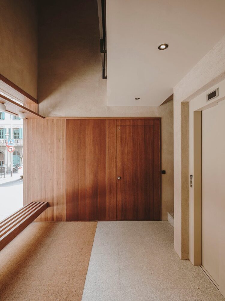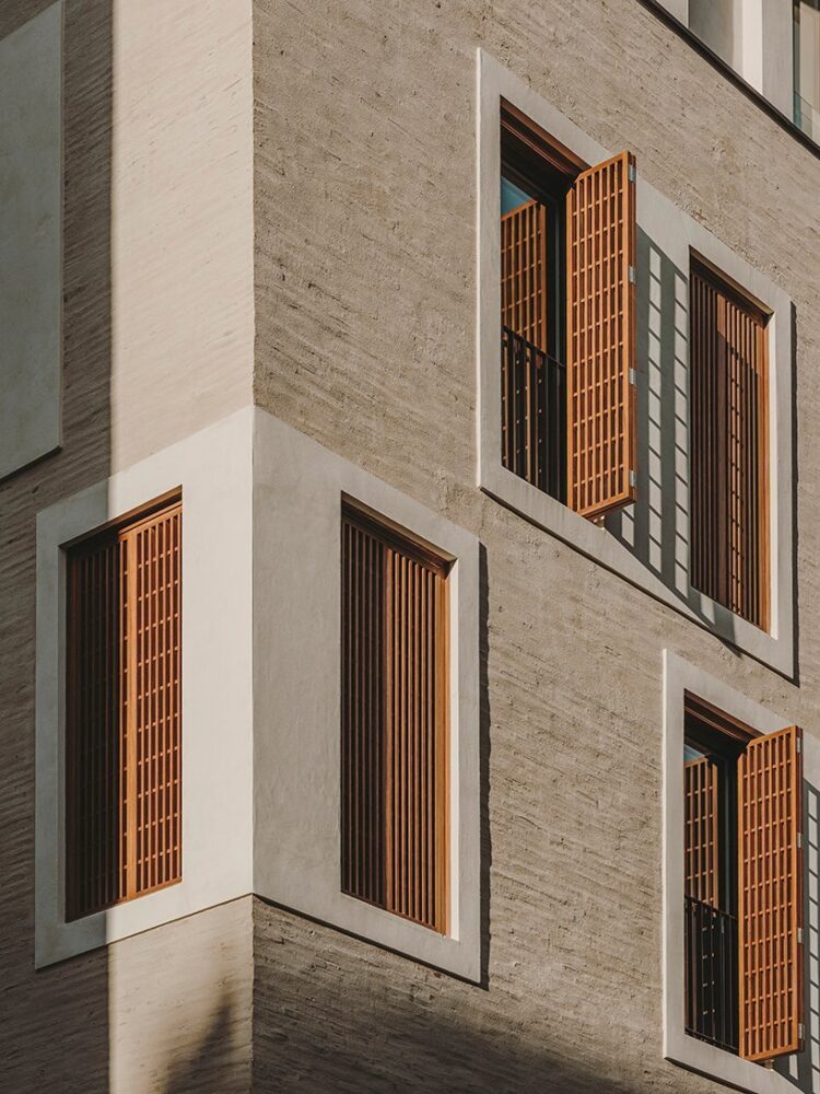 textured façades, wooden shutters & plinth detailing shape multi-dwelling building in barcelona