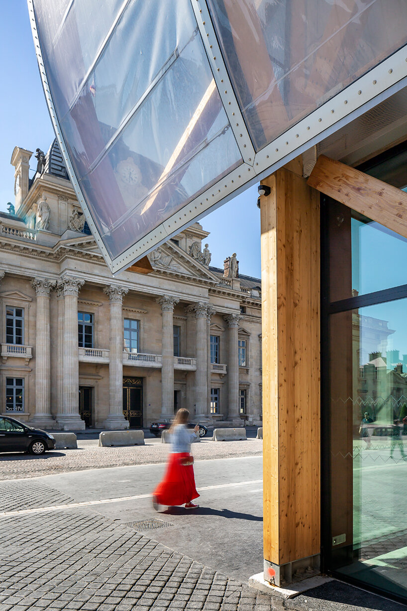 The gardens surrounding the building have also been redesigned, visually connecting to the nearby Champs-Élysées. More than 60,000 plants from 250 species were added to support biodiversity, using a rainwater-fed irrigation system built into the renovated roof. A new pedestrian entrance at Square Jean Perrin replaces a former road and improves the site’s integration with the city.