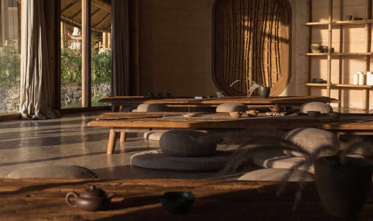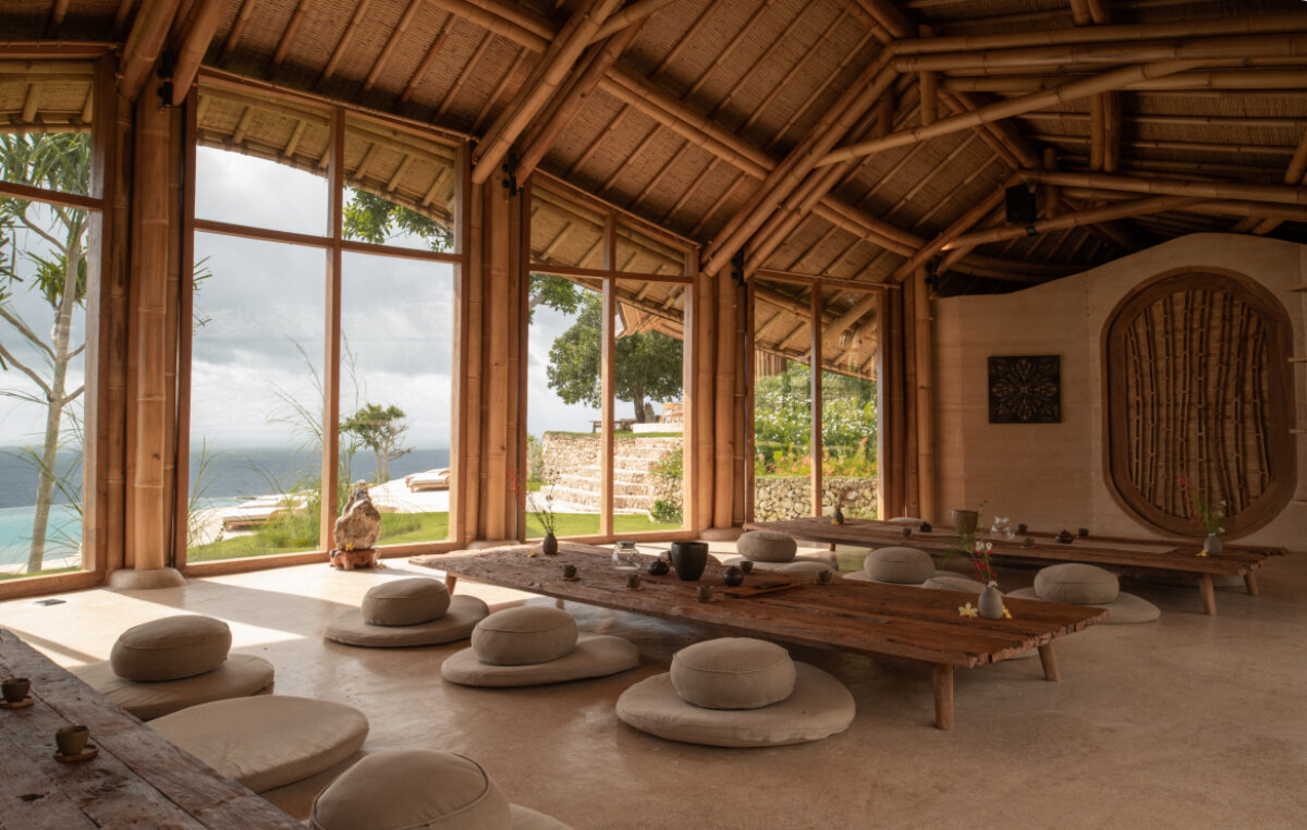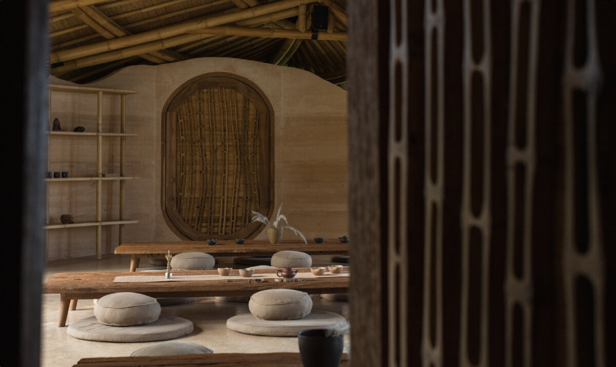 Overlooking the ocean in Indonesia and perched beside the Shell Restaurant at the Intaaya Retreat, the Fish Tail Tea Room by Pablo Luna Studio draws from the natural world to create an organic and open space. With forms and a structure inspired by the movement of a fish’s tail and its protective strength, the tea room’s design is a fluid gesture surrounded by greenery — its curved silhouette rising from the landscape and gently tapering. These undulations, from the rounded walls to the curving roofline, are shaped from locally sourced bamboo, rammed earth, and glass, appearing to respond to the motions of the wind and the waves.